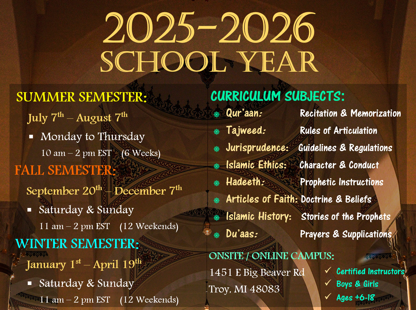The curriculum is very organized and on focus. The instructors provide high quality lectures and lessons, making it easy and fun for children to learn and grasp the importance of our precious Muslim history, fiqh, hadeeth, aqeedah, Quran and more. Thank you to the staff for their hardwork, dedication and sacrifices.